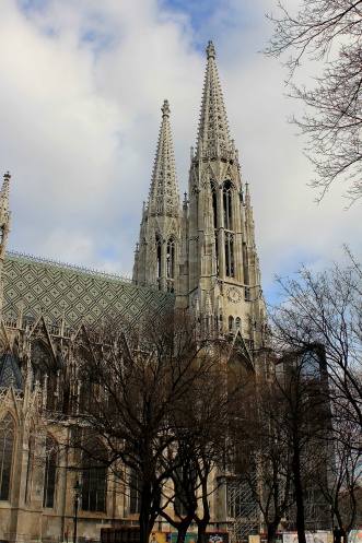 Прошли немного вперед и увидели церковь Вотивкирхе (Votivkirche), это сейчас я знаю про нее, а после поездки всех друзей на сайте донимала вопросами: «Что за здание»? Это огромная неоготическая католическая церковь, которая была построена в 1853 году; одно время она служила гарнизонной церковью.