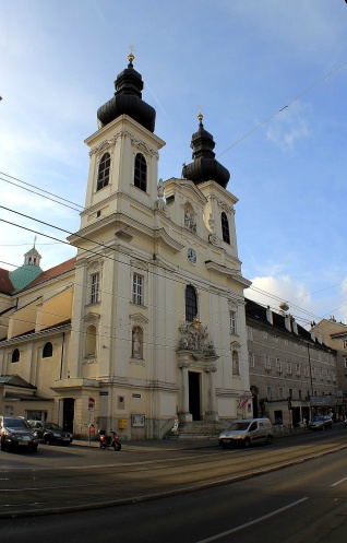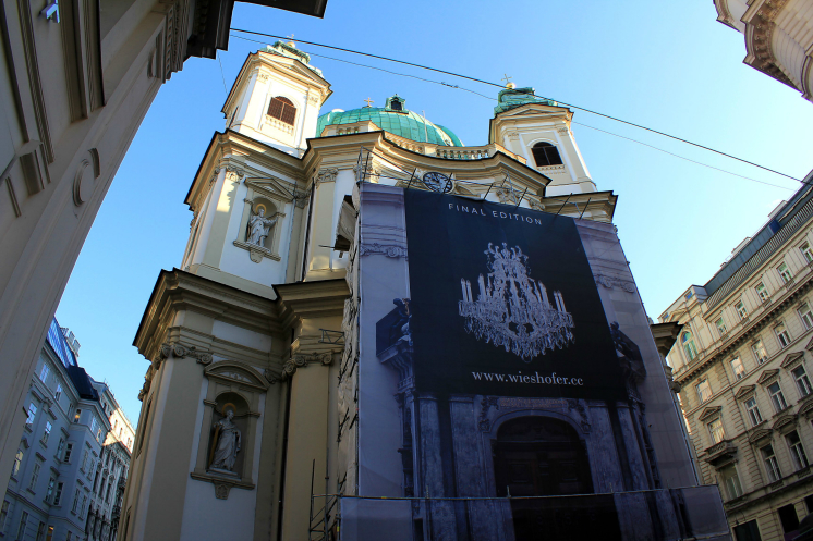 Церковь находится в исторической части города на маленькой площади Святого Петра, она как будто зажата узкими переулками и соседними зданиями, нет огромного австрийского размаха. Удивительно, она будто бы специально залита на свое место, сфотографировать целиком ее довольно сложно, мне удалось только частями.