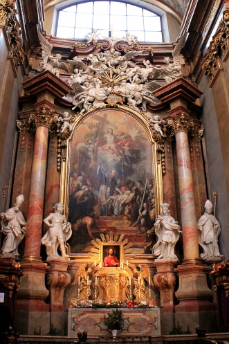 Имеются также боковые алтари, балконы, над входом один из самых замечательных органов Австрии, императорский герб над триумфальной аркой, а вверху великолепный купол, украшенный фресками Й. М. Роттмайра. Церковь Святого Петра посвящена Пресвятой Троице, поэтому она вся усеяна изображениями и символами главного таинства католической веры.