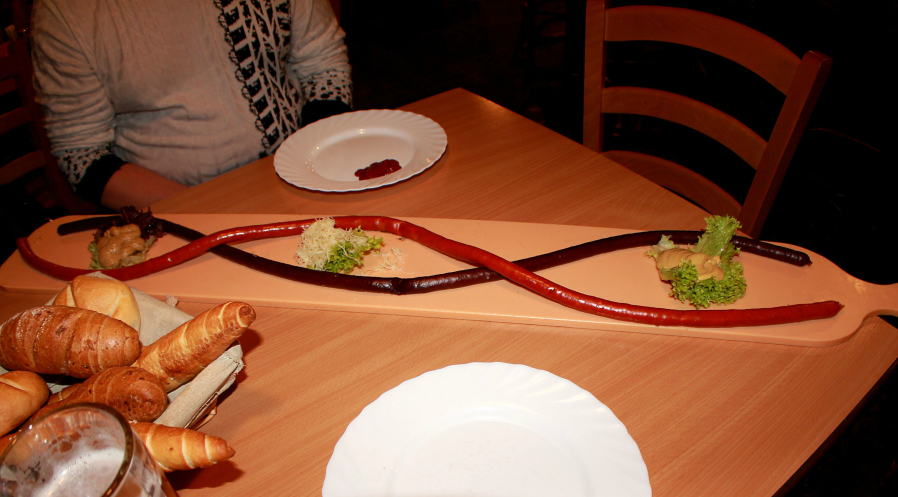 Мы польстились на двухметровую сосиску, подается она сложенной вдвое на доске в метр длиной. Здесь же и гарнир: помидоры, огурцы, горчица, капуста и т.п. Одной порции такой сосиски хватит, чтобы досыта накормить троих мужчин, так что мы вдвоем не справились))
