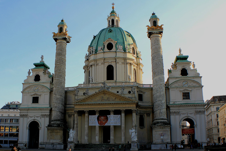 Церковь Карлскирхе (Собор Святого Карла) – одно из самых прекрасных барочных зданий в Европе. Хотя, изначально, австрийцы были против строительства церкви, и называли ее «слоном, расположившимся посреди площади». Она и впрямь кажется очень массивной и громоздкой по сравнению с Вотивкирхе, например, или с собором Святого Стефана – более изящными.