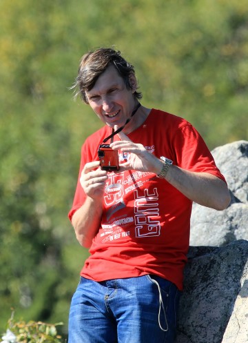Андрей, как и положено любящему мужчине, немногословен и внимателен, с хорошим чувством юмора. По моему он так и не посмотре по сторонам на вершине, все мысли только о ... (догадайтесь с первого раза?), правильно, о Рите! На спуске я что-то снимал на видео, он посоветовал комментировать по ходу, на что я ответил, что все равно уберу звук и наложу музыку.