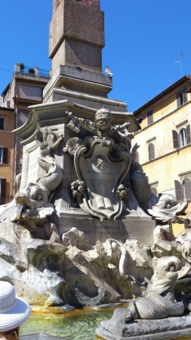 Толпы туристов также хаотически перемещается по зданию и шумят на всех языках, забыв о требованиях к посещению мест религиозного культа (соблюдение тишины и дресс-код). Сфотографировать что-нибудь нереально. В общем, мы облегченно вздохнули, покидая Пантеон, и направились к фонтану Четырех рек. Это один из самых знаменитых фонтанов Рима. Находится на пьяцца Навона. Сооружен по проекту так любимого в Италии скульптора Бернини. Вокруг привезенной из Африки колонны разлилось искусственное озерцо, а в его центре расположились аллегорические фигуры четырех рек, символизирующих континенты. Европу представляет Дунай, Индию – священный Ганг, Африку - Нил, а Америку – Ла-Плата. Композиция получилась впечатляюще живой. Фонтан Четырёх рек питается водой из древнего акведука Аква Вирго.