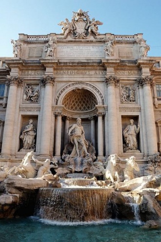 Он является самым крупным в Риме. Зрелище грандиозное. Фонтан примыкает к фасаду красивого дворца – палаццо Поли. Величественный фасад дворца и фонтан воспринимаются как единое целое. Из центральной ниши дворца как на колеснице выезжает Нептун, сидящий на морской раковине, которую тянут тритоны и морские коньки. В боковых нишах помещены барельефы. На одном из них молодая девушка указывает римским солдатам, где находится источник. От этого источника проложили акведук, по которому вода поступала в Рим. Они получили название Аква Вирго, что означает водяная девушка.