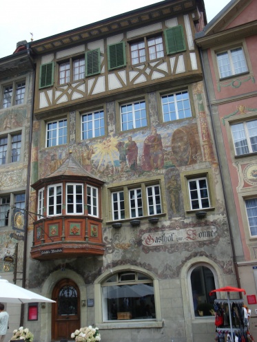 А совсем рядом от бурлящей мощи воды плавают лебеди. Лебедей там вообще много, и на Цюрихском озере, и на Женевском, и на Фирвальдштетском (Люцернском). Городишко Штамм-ам-Райн радует глаз расписными стенами старых домов.