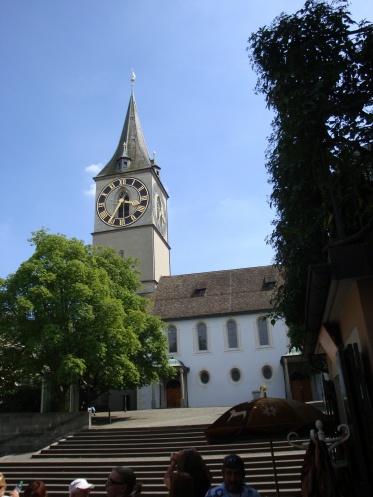 Очень приятное впечатление произвел Цюрих, не зря его облюбовали Владимир Ильич с Надеждой Константиновной. Правда, они снимали квартиру рядом с улицей известного назначения, и Надежда Константиновна смущалась, возвращаясь с рынка мимо женщин облегченного поведения. В Цюрихе тоже много фонтанов, причем из них, по утверждению гида, можно пить. Действительно, никто не заболел, утолив жажду из фонтанчика. Витражи Шагала в Фраумюнстере особого впечатления не произвели (наверное, меня вряд ли смогут потрясти какие-либо витражи после Сен-Шапели в Париже).