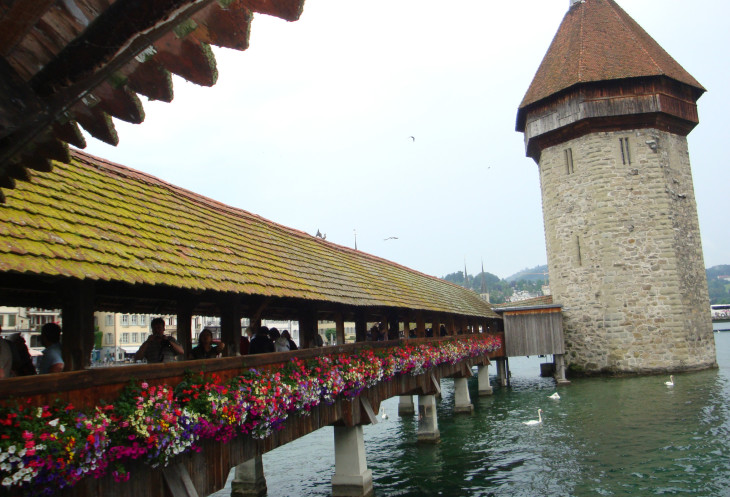 В Люцерне тоже много таких домов с фресками. Но главная «фишка» Люцерна — деревянные крытые мосты с картинами 17 века. Часовенный сильно пострадал в 1993 году от пожара, но восстановлен и украшен цветами.