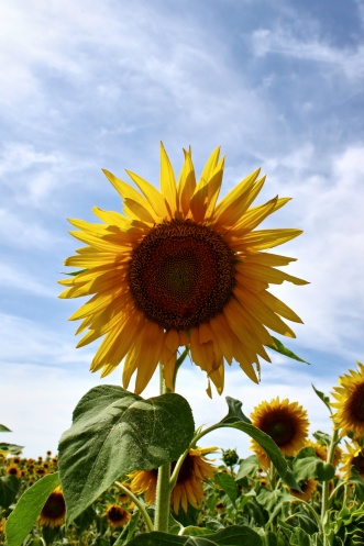 Близ деревни нашу дорогу скрасили поля подсолнечника, тут вдали от трасс они как то ярче и свежей, маленькие дети солнца провожали его своими взглядами.