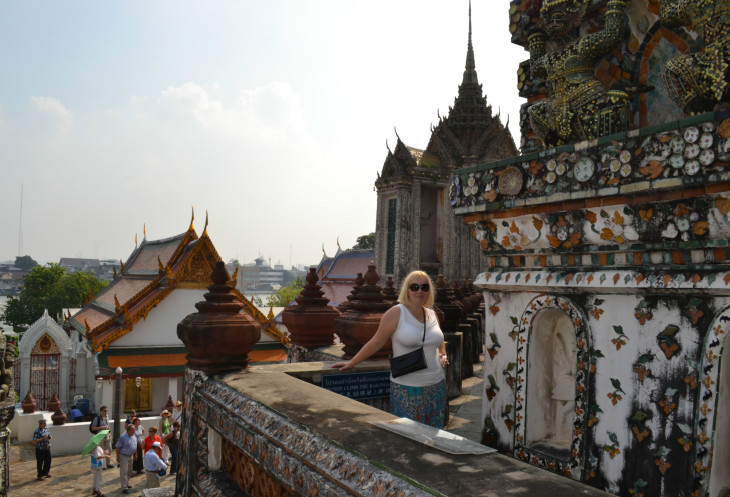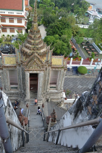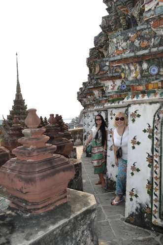… описать не возможно. Храм - олицетворяет гору Меру, обиталище богов в кхмерской мифологии. Я смогла забраться только на два яруса главного пранга, на нем выложены такие красивые узоры из кусочков фарфора, складывающиеся в удивительную разноцветную мозаику. Выписка из статьи про храм: « На разных уровнях располагаются статуи различных мнозологических существ, таких как демоны якша и полуптицы-полулюди киннари. На первом ярусе по четырем сторонам света стоят мондопы, в которых хранятся статуи, изображающие Будду в наиболее значимые моменты его жизни: при рождении (на севере), медитации (на востоке), во время первой проповеди (на юге) и входящим в Нирвану (на западе). Вторая платформа окружает сам пранг, вход в который закрыт и охраняется четырьмя статуями индийского бога Индры на трехголовом слоне Эраване. В нишах малых прангов находятся статуи Пхра Пай, бога Ветра, верхом на лошади.»