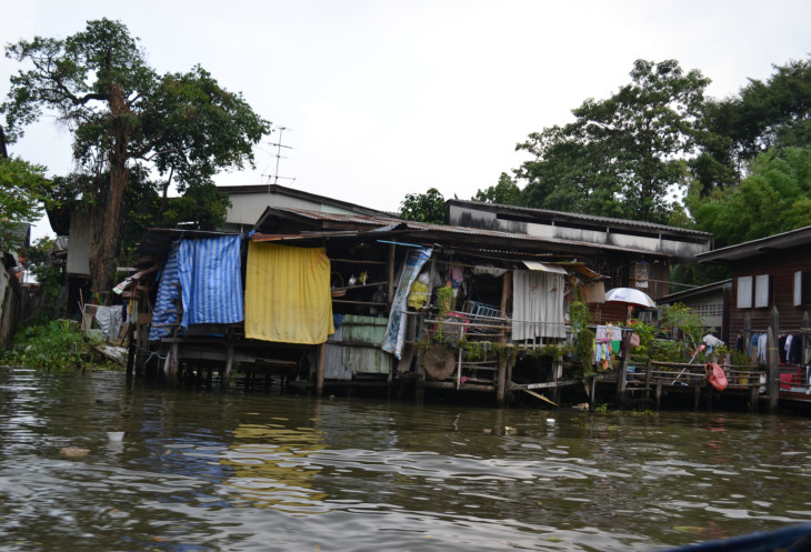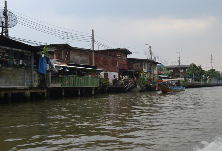 Плывя по каналам мы видели деревянные и очень убогие дома на сваях, которые оберегают их от наводнений и муссонных Вода в каналах очень грязная, но тем не менее детишки купаются в ней, тут же взрослые ловят рыбу и делают из нее шашлыки для макашниц (после увиденного мы зареклись рыбу у макашниц не покупать). И вот проезжая эти нищенские дома, мы видим построенных на сваях шикарный дом, с красивым садиком и беседкой…и как позже оказалось таких домов было не мало. Да уж… Решили сделать звонок другу, чтобы узнать как он проводит с женой время в Бангкоке, но не успели взять телефон, нам на встречу двигается длинохвостка со Шлыгиными…