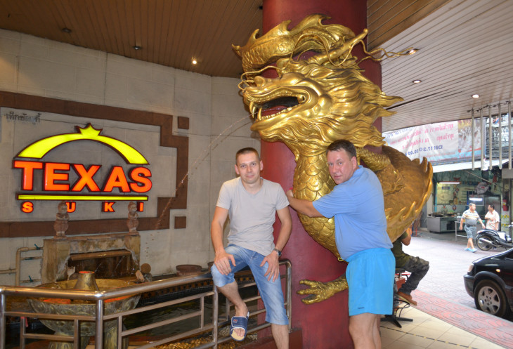 Показывает направо и грит, нужно ехать туда…кто-то позволили с ней не согласится…спорили долго, решили отправить племянницу к тайцам (она единственная знает английский), но мы просчитались… у них получилась я тебя не понимать…взяли по бутылки пива пока решали…поняли что маловато, пошли за второй..решили- едим направо. Ох не легкое это дело садится в речные трамвайчики, нам удалось и мы поплыли…плыли мы не долго, потому как оказалось , что следующая остановка конечная…поржали. Куда дальше? Видим тук-тукеров. Ух Вы мои золотые, мы идем к Вам. А они нам , типа китайский квартал не работает, давайте мы Вас по достопримечательностям (магазинам) повозим, типа только за бензин оплатите. Ну мы эту фишку знаем, плюнули пошли дальше. Ловим тук-тук, грим куда нужно- соглашается. Сам договаривается с другим тук-туком (все таки нас 6 человек), мы падаем и держим путь к заветной утки по-пекинске. Приехали. Отклонились от «главной улице» где рестораны изначально подороже, нашли ЕГО…Ресторан –сказка.