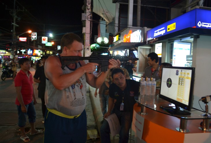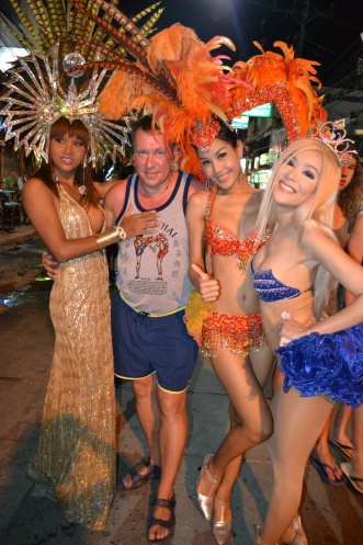 а мы пошли с Натали отведать ролы. Я смотрела на проходящих мимо туристов, на пары европейцев с таичками. Девченки хорошенькие в большинстве своем. Да уж…наверно для мужчин Тайланд- это сексуальный рай. Потом перебрались в бар рядом с Банглд Роуд, поужинали. Блин, мы там постоянно ели, почему-то. Ну все, пора. Девченки с обоих сторон зазывают в бары, на пинг-понг… бесконечно предлагают всякие фанарики, очки… Вдруг Шлыгин толкает меня и говорит, посмотри какие красотки стоят. Смотрю в ту сторону, куда протянут палец…Ага, трансвеститы. Шлыгин, когда ему объяснили кто это, круто вырывается вперед , отметая все предложения сфоткаться с ними, на ходу бросает, чего это я с переодетыми мужиками фотаться буду, ведь не гомосятина он…..Отступление не большое. Вы не подумайте, хоть мы и из Челябинска, но адекватные люди. Шлыгин просто не так много знал о стране и об отдыхе в частности. У него на первом месте- работа. Поэтому за границей полноценный отдых для него впервые, поэтому нужно нормально воспринимать его реакцию, реакцию мужика, впервые посетившего Тайланд. Мы с Натали похохотали над его реакцией. Я говорю: «Шлыгин, блин, мы в Тайланде, пойдем сфотаемся с девченками… ну эта фотка должна быть у каждого». Шлыгин оглянулся, и грит, угу наверно все-таки нужно вернуться. Вернулись, заплатили за каждого по 100 батт и началась фотосессия. Серегу обнимали со всех сторон, он позировал, как настоящая Звязда…