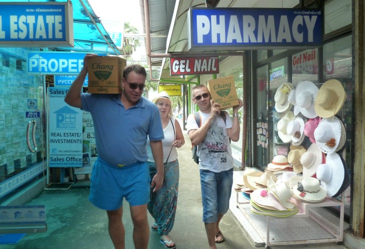 Вечером запланировали выйти погулять, естественно покушать и массаж. Первый день прошел стандартным пакетом для вновь прибывших…а нет…мы пришли в магазин 7 leven за пивком, двинулись к холодильнику, сгребли все что было… подходим к кассе… кассиры немного шокированы, переспрашивали несколько раз все ли мы покупаем, потом предложили боксы…мы долго не понимали чего это такое, они вынесли ящик пива…ну, решили мы, это по нашему и запросили «ту бокс». Тайцы веселились, увидев нас, кричали вслед «наливай», а наши парни гордо отвечали «шопинг бир».
