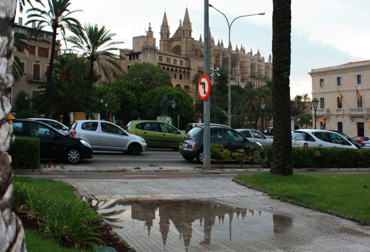 И вот, наконец, мы видим знаменитый Кафедральный собор Пальма де Майорки. Он величественно отражается в луже и манит к себе...