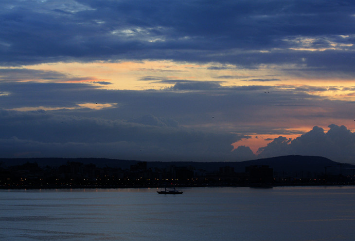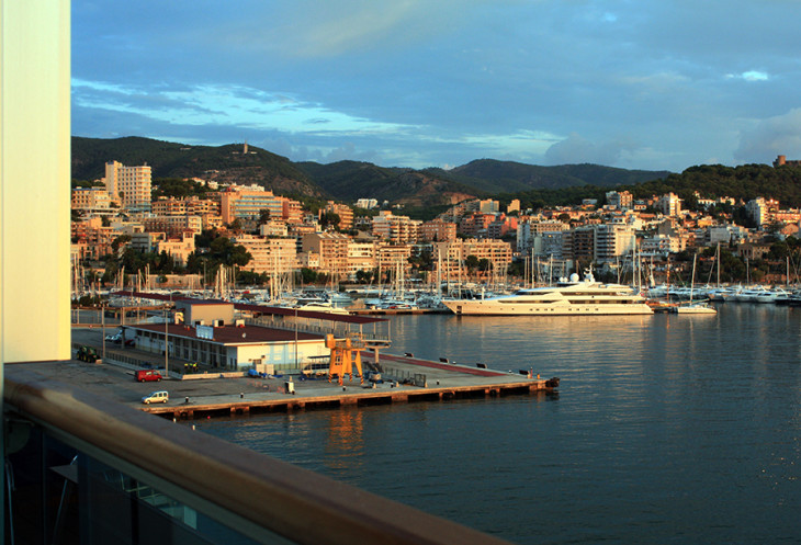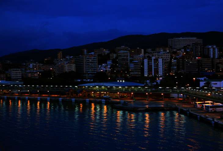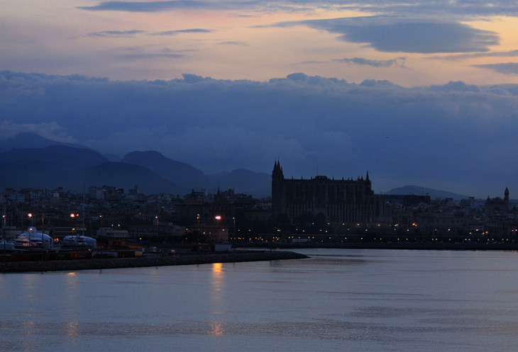 Первая остановка в нашем морском путешествии - остров Майорка. Майорка или Мальорка - самый большой из Балеарских островов. Пальма-де-Майорка - столица испанской провинции Балеарские острова. Расположена в Пальмской бухте на юге острова. Прибываем рано утром. Проснувшись, первым делом выхожу на балкон и вижу берег, усеянный огоньками. Сразу же пытаюсь запечатлеть эту красоту, с каждой минутой меняющую цвета и оттенки. Корабль сильно вибрирует, поэтому снять со штатива, на длинной выдержке, не удалось...Снимок получился не резким...но всё-равно его люблю.