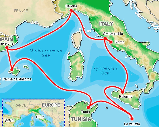 Наш маршрут: Москва - Цюрих - Барселона - Пальма-де-Майорка -Тунис - Мальта - Палермо - Чивитавекия - Рим - Савона - Барселона - Мюнхен -Москва. Три дня в Барселоне и 7 дней в круизе.