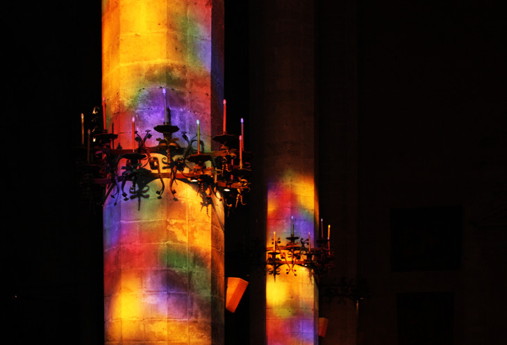 Свет проходящий сквозь витражи собора отражается от колонн...