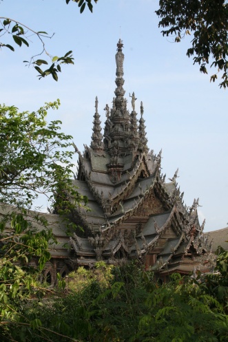 и таки доехали до Walking street, но днем. Даже не знаю, что произвело большее впечатление – тропическая природа и животные, или немыслимый деревянный храм – это надо увидеть! Димка радовался одинаково и жирафам-бинтуронгам- бегемотам и всем остальным – а потом также радостно было в саду – там везде такие огромные бабочки летают, купили кукурузу слонов угостить, а Дима схомячил это угощение сам…Берегись обезьянок – следовало бы на писать на входе – смелые девоньки прямо-таки отвоёвывают угощение, предназначенное для других зверей. Одна на меня напала и вцепилась в фотоаппарат –требовала отдать весь имеющийся бамбук.