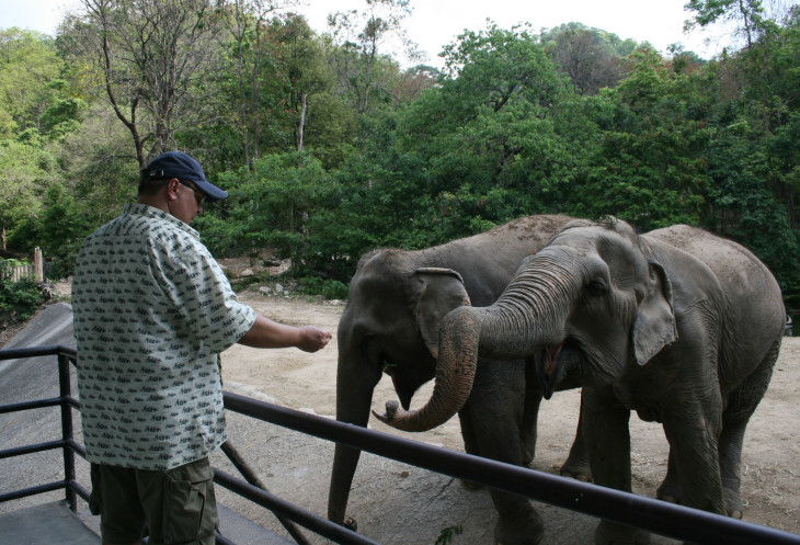 и таки доехали до Walking street, но днем. Даже не знаю, что произвело большее впечатление – тропическая природа и животные, или  немыслимый деревянный храм – это надо увидеть! Димка радовался одинаково и жирафам-бинтуронгам- бегемотам  и всем остальным – а потом также радостно было  в саду – там везде такие огромные бабочки летают, купили кукурузу слонов угостить, а Дима схомячил это угощение сам…Берегись обезьянок – следовало бы на писать на входе – смелые девоньки прямо-таки отвоёвывают угощение, предназначенное для других зверей. Одна на меня напала и вцепилась в фотоаппарат –требовала отдать весь имеющийся бамбук.