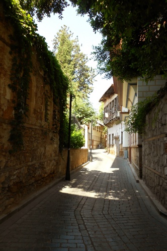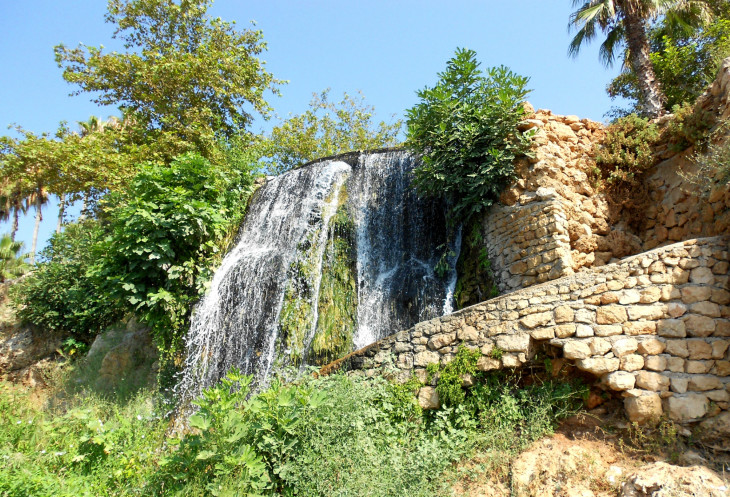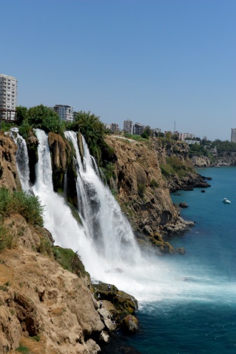 На последний день у нас были самые интересные планы. Хотелось все-таки увидеть исторический центр в Антальи и водопад нижний Дуден. Про центр мы спросили у нашего отельного гида, его объяснение не было слишком подробным, он посоветовал нам доехать до конца пляжа Коньялти, а дальше «ну вы же шустрые, там доберетесь». Из этого мы решили, что выйдя из автобуса, мы должны дальше идти пешком. По большому счету, не ошиблись, но было жарковато. Шли мы так вдоль моря, любовались видами, рассматривали пальмы, изнывали от жары. Уже, наконец-то показался старый порт. И тут мы увидели его — маленький водопад. Он такой чудесный — тонкие струйки холодной воды сбегают по какой-то старой кирпичной кладке. Возможно, это просто стекала вода из фонтана наверху, или еще какой техногенный ручеек, нам в тот момент было все равно — жара в 36 градусов взяла свое. Мы залезли под холодные струи водопада, брызгались как дети, смеялись, фотографировались.