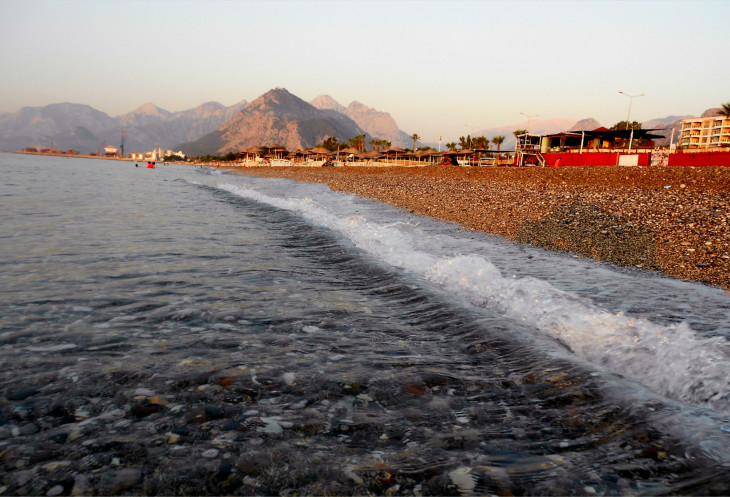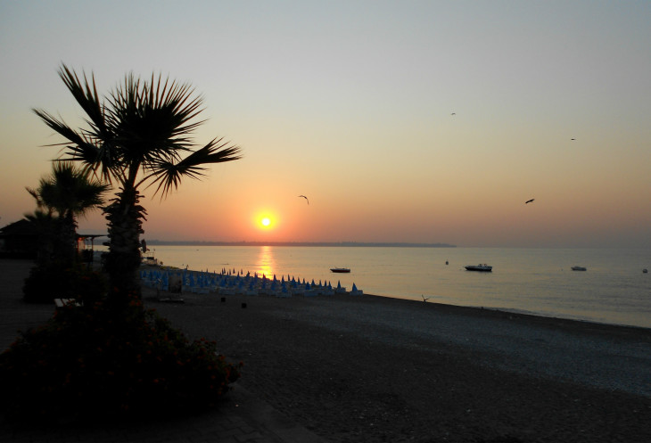На следующее утро у нас был запланирован аквапарк. Но он работает только часов с десяти, по-моему, так что у нас еще было время утром. А поскольку, наше время отличалось от Турецкого на 4 часа, то в шесть утра местного времени я уже была давно на ногах, и отправилась встречать рассвет на пляже. А подруга моя сказала, что это все равно шесть утра и осталась спать. И, по-моему, много потеряла. Рано утром на улицах туристического города тихо и пустынно. На пляже почти никого нет, только несколько турецких компаний, которые, похоже тут ночевали, а сейчас начали просыпаться. Я успела вовремя — рассвет только начинался, над горами еще не ушла дымка, а небо и море были одинакового белесого цвета. Вода в море удивительно теплая — теплее приятного утреннего воздуха.