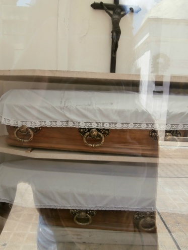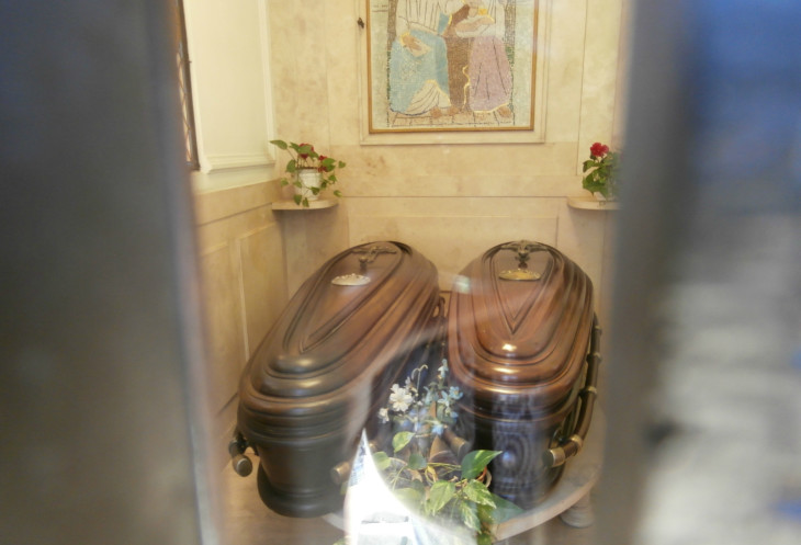 Расскажу еще об одной удивительной особенности. Некоторые склепы имеют стеклянные двери или окна, и внутри можно наблюдать настоящие гробы.