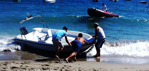Третий день пребывания на острове трех морей навеял на нас водное настроение. Для начала очень захотелось с головой окунуться в Ионическое море, но погода, так радостно встретившая нас на старте приподнесла нам премерзейший сюрприз. Небольшой, но ощутимый шторм, который начисто отбил желание изображать из себя дельфина. Зато шторм помог сближению с местным населением путем коллективного вытаскивания лодок на берег во избежание их самостоятельного путешествия по волнам.