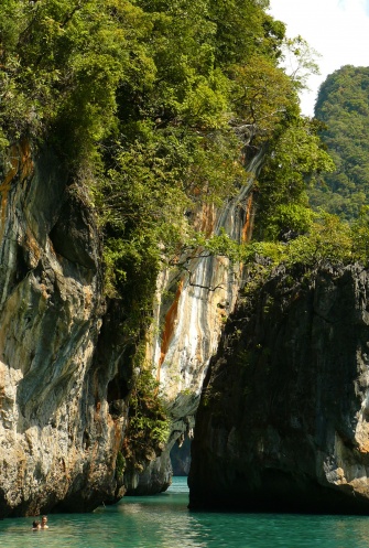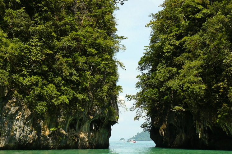 Экскурсия номер 2. Этот день выдался напротив очень солнечным (для поездки по островам это немаловажно). Забрали нас из отеля вовремя, как и накануне. Привезли на распределительный пункт, куда стекались группы на все морские экскурсии у данного организатора. Наша кучка на Хонг была самой малочисленной. Толпа, направляющаяся на ПхиПхи, была просто огромной. После того как, весь народ был доставлен и распределен, мы разошлись по спидботам. Мы по незнанию сначала сели на носу…хотя море было спокойное, трясло там ужасно. К счастью следующая остановка была близко (заезжали за двумя туристами на Рейлей) и мы пересели на корму. Дальше были две остановки по пути к Хонгу. Море чистое и прозрачное (в АоНанге и на Рейлее мутноватое), природа красивущая.
