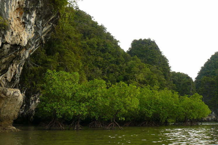 и поплыли, сначала по открытому пространству залива, а потом стали постепенно заходить в узкие протоки, окруженные скалами и зарослями мангровых деревьев. День выдался пасмурным, периодически накрапывал дождь, но любоваться видами и грести нам это не мешало :-)