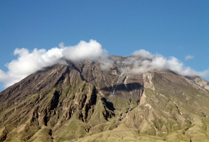 За край вулкана зацепилось облако, но сам вулкан спокоен.