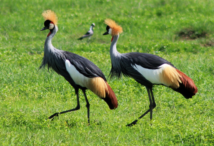 На дорожках появляется грязь, но, зато все вокруг становится свежим, умытым. Вон, какая красивая парочка чистеньких венценосных журавлей: