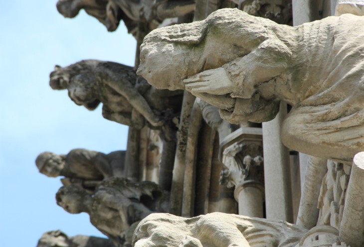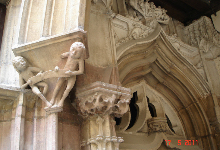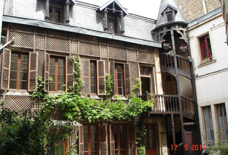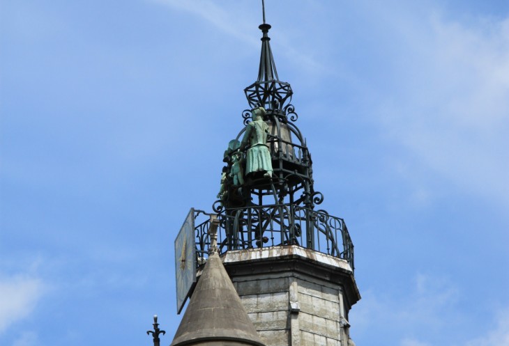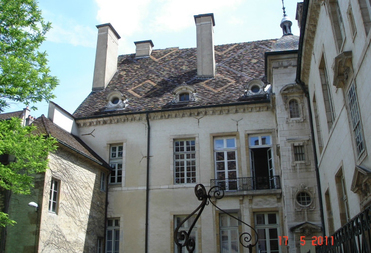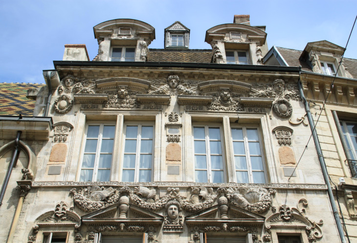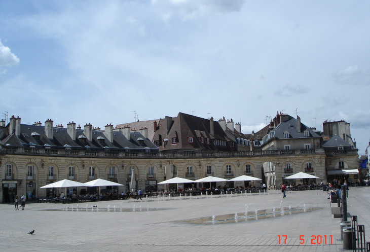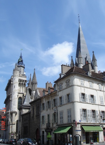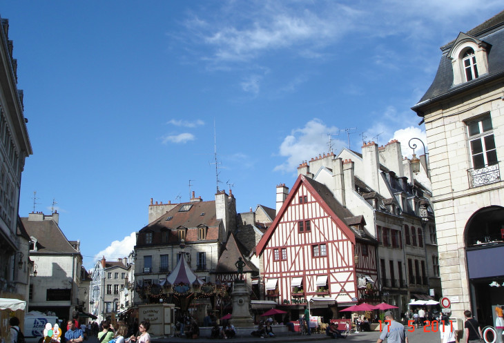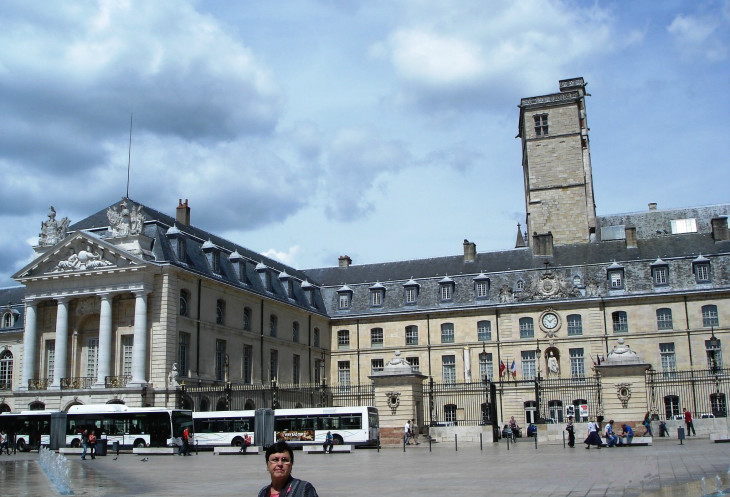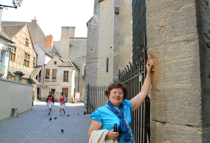 Этот суровый контролёр прокомпостировал наши билеты звёздочкой ещё раз уже во время пути. 1 час 45 минут, первая остановка и мы в Дижоне. Самое интересное в путешествии, сначала всё узнать о месте, потом поехать и увидеть всё своими глазами. Мы вышли с вокзала и пошли "по следам совы", следуя указаниям металлических стрелок, вмонтированных в мостовую. Содержание маршрута у нас было распечатано, но его можно взять на русском языке в туристическом офисе рядом с вокзалом. Берёшь описание и читаешь по цифре, указанной на табличке. Первая табличка на пл. Дарси, где городской парк. Здесь же каменная фигура белого медведя, установленная в память о Франсуа Помпоне- известном скульпторе- анималисте. Здесь же особняк Ла- Крош, здание почтамта, и Триумфальная арка Порт Гийом- то, что осталось от средневековой крепостной стены. Рядом с богато декорированным зданием Почты можно увидеть и Дом с пагодами (крыша необычной формы). Дальше мы вышли к рыночной площади, и т.к. оказались в Дижоне в базарный день, пошли поглазеть на ряды товаров, стараясь не терять под ногами верные стрелочки- указатели. Старый город сосредоточен вокруг пл. Франсуа Рюда (№.6 в нашем маршруте), на которой расположен фонтан "Давильщик винограда"- своего рода визитная карточка Дижона. От неё мы уже пошли по стрелкам, рассматривая исторические здания. Например, дом мэра Майяра (1560г), украшенный барельефами персонажей с салфетками и бургунской капустой. Или особняк Шамбеллана (1490г)- тоже мэра Дижона. Здесь мы знали, что надо свернуть во двор, который считается шедевром готической архитектуры. Если подняться по винтовой лестнице, то можно увидеть фигуру садовника с корзиной. Она поддерживает свод. Очень понравилось. Потом мы дошли до дижонского нотр-дама (Собора Богоматери 1220-1240 годы).Уникальное сооружение, фасад которого украшен тремя рядами химер. А на самом верхнем ярусе Собор украшают часы Жакмар, которые с 1383 года по наши дни отбивают каждые четверть часа. Интересно то, что в 17 веке Жакмару добавили жену Жаклин, в 18 веке сына Жаклине, а в 19-дочку Жаклинет. Слева на соборе нахохлилась маленькая фигурка совы- дижонского талисмана, за которую надо подержаться левой рукой и загадать желание. Ну, как без этого?! В доме купца Мильера снимался фильм "Сирано Де Бержерак" с Жераром Депардье в главной роли. И ещё много симпатичных домов и домиков, дворов и улиц мы исшагали в Дижоне. Очень красивые крыши с цветной черепицей. Причём сначала мы старались двигаться строго по стрелкам, а потом уже пошли по второму кругу просто гулять, дегустировать в магазинчиках горчицу, прикупили бургундского. Горчица, кстати, продаётся в разной упаковке. Мы накупили и в обычной, и наборчиками из 8-12 малюсеньких очень нарядных баночек для гостинцев. Горчица в них разноцветная- желтая, лимонная, зелёная, розовая. Сувениры получились великолепные. Потом дошли до Дворца Герцогов Бургундии, который смотрит фасадом на полукруглую площадь Освобождения, обустроенную в 1686 году архитектором Мансаром ( тем самым, который придумал скатные крыши, именуемые теперь мансардами). Проголодавшись, обустроились в кафе, "накирялись" (опять же в честь мэра Дижона по фамилии Кир), съели "изыскано поданного" лукового супа и пошли в обратном направлении по ул. Свободы. До поезда ещё было время. Мы отдохнули в парке, затем 1ч 45 минут и снова Па