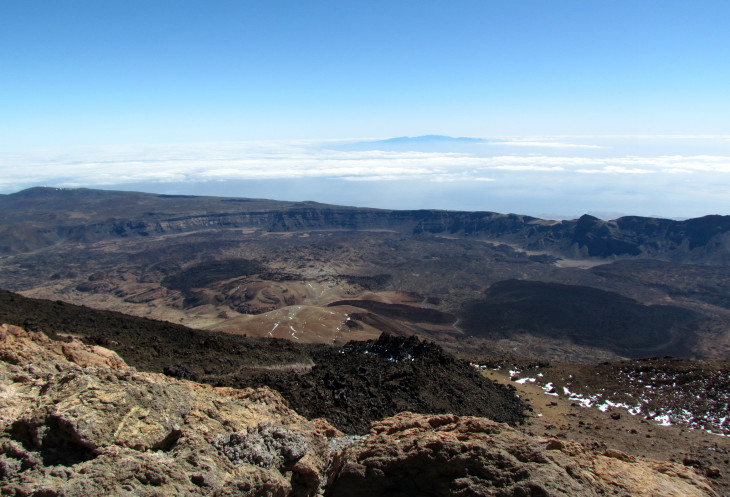 На фото со спутника хорошо видно, что вулкан Тейде — «двухэтажный». Сначала возник вулкан Лас Каньядас, затем его вершина провалилась под собственной тяжестью, образовав впадину со стенками, напоминающую по форме гигантский кратер. По-научному такая конструкция называется кальдера, что значит «котел». А уже потом внутри этой самой кальдеры вырос пик Тейде. Получился вулкан в вулкане. Кальдера Лас Каньядас по площади одна из самых значительных в мире, ее наибольший диаметр составляет примерно 16 км.