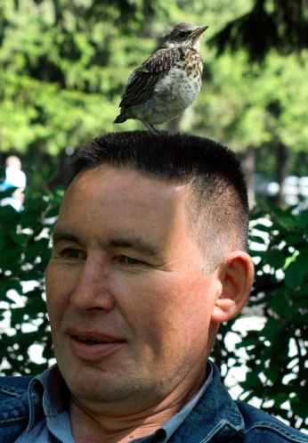 Прыгал дроздёнок по земле, прыгал, допрыгал до мирно сидевшего на лавочке мужчины, запрыгнул ему на ногу, огляделся - нет, низко!