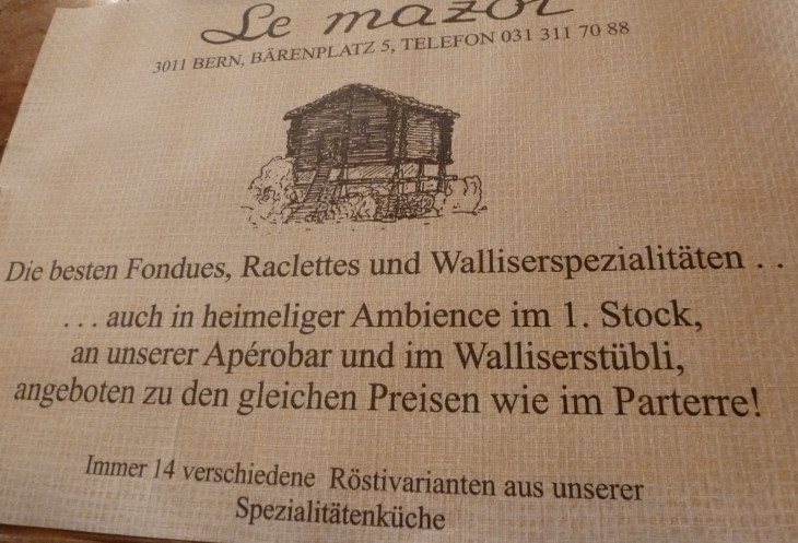 Ресторан высокого уровня и фондю абсолютно не совместимы, так что попробовать его можно только в специфических местах: грубая отделка и мебель, обязательное отсутствие скатертей и простая посуда, а главное, фирменный сырный запах. Именно таким и был ресторанчик «Le mazot» в центре Берна, куда мы отправились, чтобы насладиться распиаренным швейцарским блюдом.