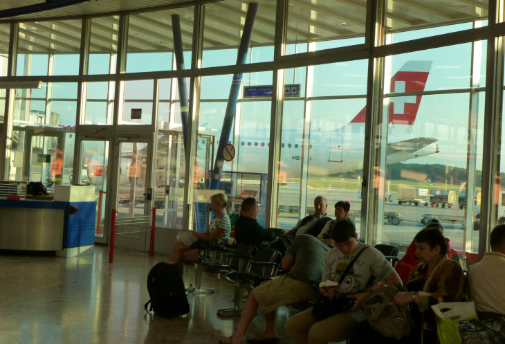 Раннее утро, дорога в аэропорт по спящему городу… От премудростей автоматической регистрации нас избавила гид Ольга, терпеливо зарегистрировав каждого, за что ей огромное спасибо. Неспешные таможенные процедуры, стандартные шоколад, сыр и кирш в DutyFree, поиски паспортного контроля, по причине традиционно отсутствующих указателей и на последние франки кофе с шоколадом и видом на наш самолетик…