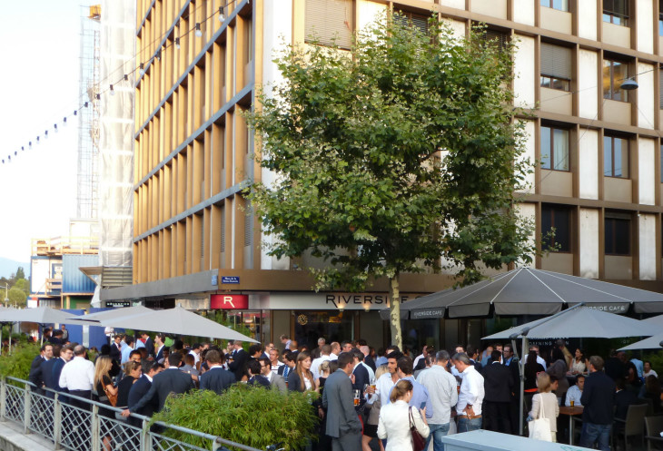 Молодые люди в строгих костюмах с бокалами что-то возбужденно обсуждают, наверно отмечают окончание какого-нибудь международного форума – пожалуй, типичная картинка для Женевы.