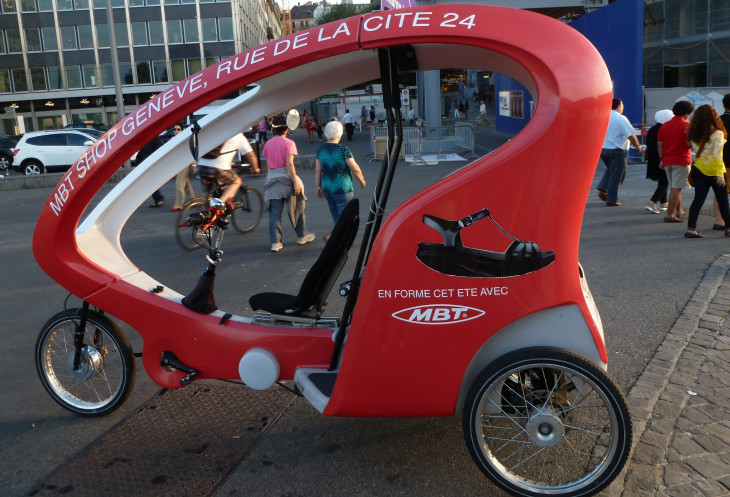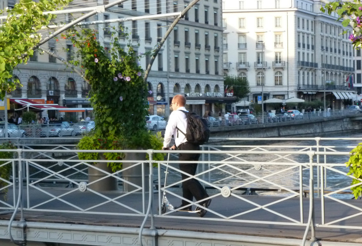 Молодой человек, пролетев мимо на самокате, с кем-то весело щебечет по телефону, и еще одно, не менее забавное средство передвижения…