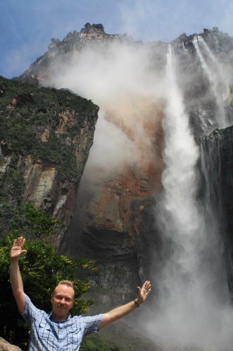 Поднимаемся вверх быстрым темпом, наш проводник практически бежит. Иногда приходится лезть по камням и корням почти вертикально. Наконец достигаем Mirador viewpoint - это смотровая площадка, с которой сделано большинство обязательных фотоснимков «Я и Анхель». Народ усаживается на больших валунах возле обрыва и фотографируется на фоне водопада. Вершина горы по-прежнему в тучах, но погода меняется буквально каждую минуту. И нам повезло – внезапно тучи над Анхелем разошлись, и водопад предстал пред нами во всей красе. Зрелище потрясающее!