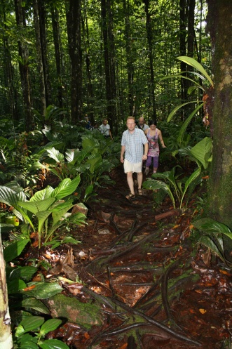 Вволю накупавшись, идем назад. Но спускаться по такой дороге еще сложнее, чем подниматься! Очень круто и скользко, приходится идти медленно, держаться за камни, деревья и корни. Неудачно поскользнувшись, Денис падает и прилично расшибает коленку. Та же участь постигает и оптимистичного француза-биолога, который всю дорогу искал насекомых и показывал их своим приятелям. Но больше всех не повезло нашему гиду – Хосе Карлос где-то упал так, что хромал всю обратную часть пути.
