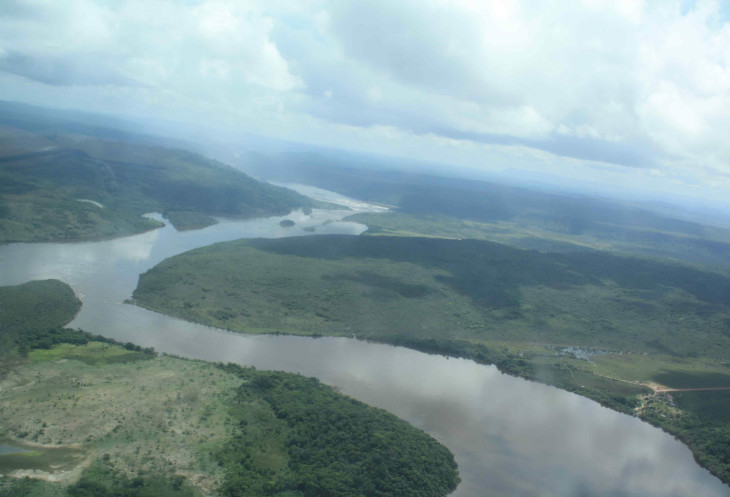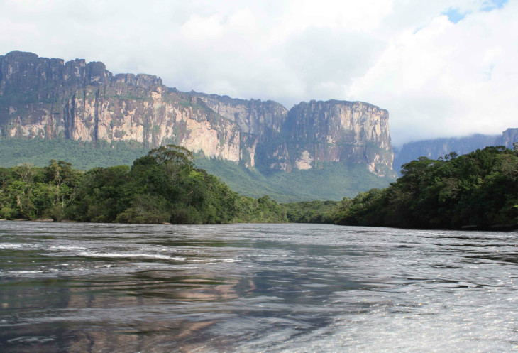Дальнейший путь к Анхелю лежит по Rio Churun – это достаточно узкая речка с многочисленными порогами. Наша лодка на скорости обходит пороги вблизи берега, так что приходится нагибать голову от нависающих над водой веток деревьев. С одной стороны открываются виды на Ауян-тепуй, с другой – на тепуи «Солнце» и «Луна» (Wei tu pu). Ближе к Анхелю вдоль реки появляются огромные камни, очевидно, отколовшиеся от тепуев.