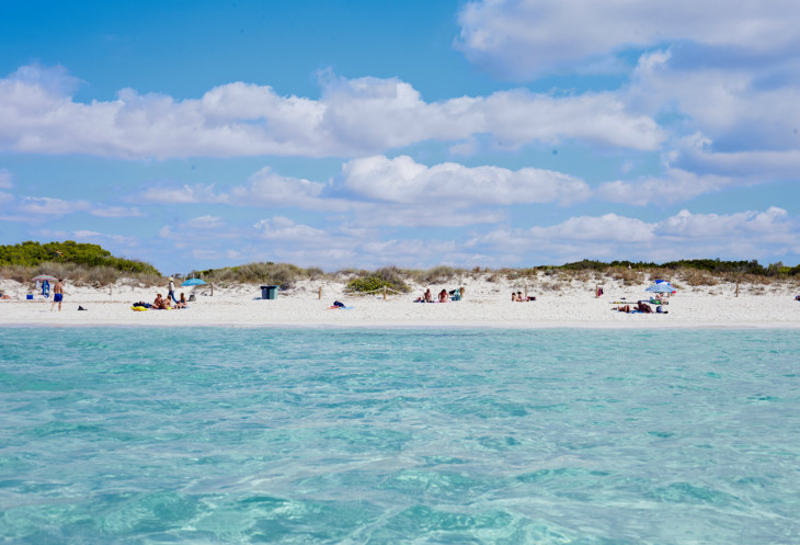 Итак, сегодня отправляемся, пожалуй, на самый известный пляж Майорки Es Trenc. По дороге на Santanyi, после того, как проедете Campos, все время поворачивайте по указателям на пляж. Знаменит он своем белым песком и чистейшей водой. Это место нередко сравнивают с пляжами карибского региона. Пальм там, правда, нет. Пляж условно дикий, протянувшийся на несколько километров. Есть паркинг (стоит 6 евро за весь день), пару кафешек и немного лежаков с зонтами. Но большая часть пляжа свободна от прелестей цивилизации. Однако туристов это не пугает, а наоборот привлекает толпу желающих позагорать на этом «карибском» чуде. Особенно много здесь немецких нудистов, преимущественно мужского пола.
