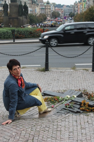 памятник Яну Палаху в виде деревянного креста, вмурованного в каменную мостовую
