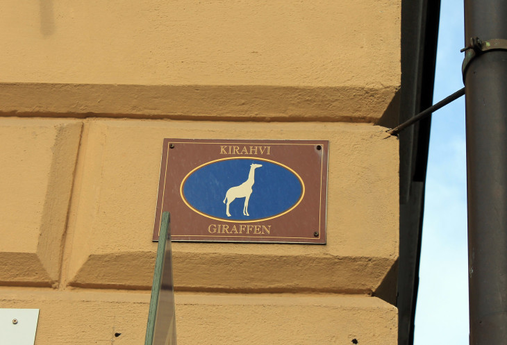 хихикаем под табличкой, надпись и рисунок на которой, по нашему мнению означают «Улица имени Жирафа»,