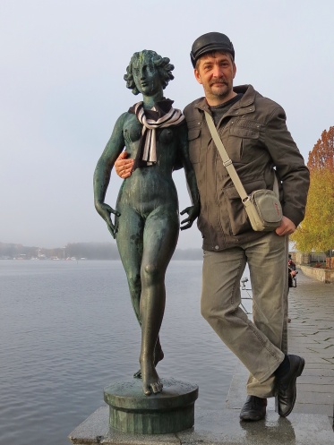 Автобус. Другой берег. Ратуша. Точно также не видно острова Риддархольм, на котором только что были. Гуляем возле ратуши, фотографируем. Традиционное фото со стокгольмской подружкой. Как она тут без меня, да еще в такой холод? Совсем замерзла, небось. Снял шарфик, надел подружке. Сфотографировались.