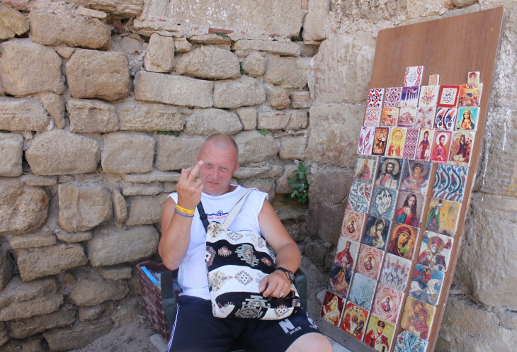 По идее муж уже должен быть на остановке. Но его НЕТ. Сразу начала волноваться, т.к. я гуляла по развалинам минут 30, он ТОЧНО должен быть тут уже. 20, 30, 40 минут ожидания - его нет. У меня в голове проносятся всякие картинки: от похищения с целью выкупа, до потери сознания от жары... Ох. уж эти женщины... Да еще сумка с водой, деньгами - все у него. Уже представляю себя мучеником, бредущим по безводному пространству, обезвоженной и обессиленной....