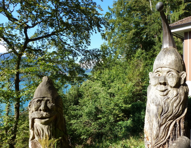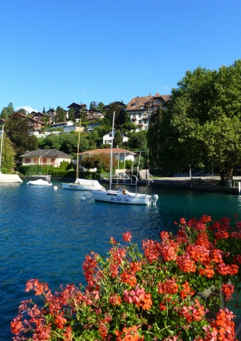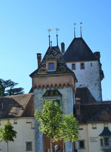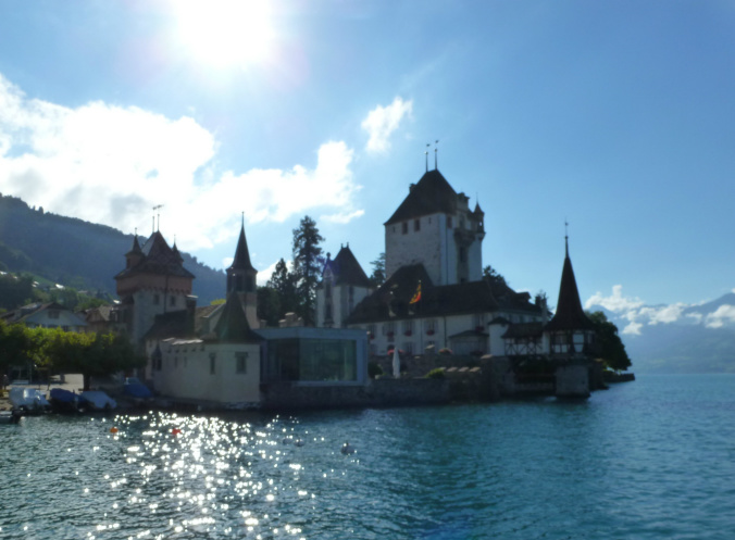 Городок Оберхофен, который в Швейцарии величают Оберхофен-ам-Тунерзее, оказался, действительно, красивым и достаточно старинным местечком (впервые он упоминается в 1133 году). Шумной гурьбой мы вывалили на маленькую, увитую красной геранью пристань и вдруг затихли… Старинный замок с очаровательной башенкой, соединенной с ним крытой галереей, склонился над озером, солнечные лучики отражаются в воде миллионами бриллиантов, и гора Низен в ожерелье облаков…