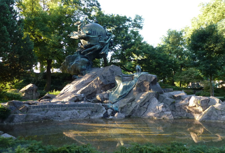 На обратном пути забежала в парк Кляйне Шанце, чтобы сфотографировать Мемориал Всемирного Почтового Союза (в Берне расположена его штаб-квартира). Всемирный Почтовый Союз основан в 1874 году и объединяет практически все страны мира, в том числе и Россию. Мемориал выполнен в начале XX века французским скульптором Шарлем Рене Де Пол Де Сан-Марко из гранита и бронзы. Он представляет собой земной шар, вокруг которого пять фигур, символизирующие пять континентов, передают друг другу письмо.