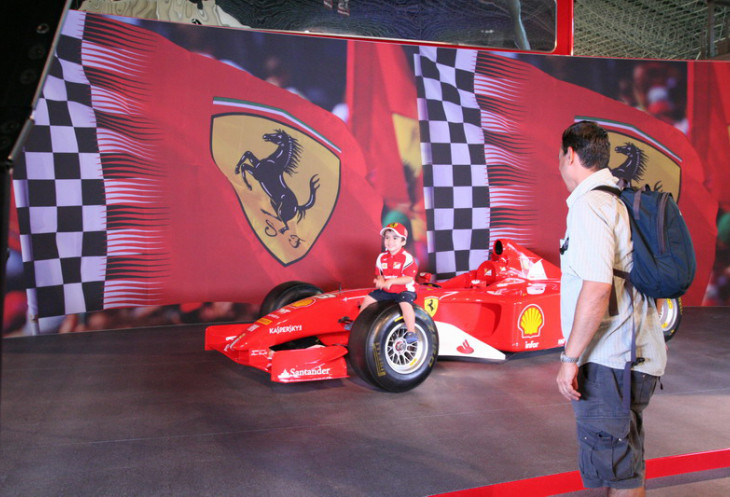 который находится тут же неподалёку. Видели рядом и уникальный новый аквапарк Yas Waterworld, но на него у нас уже не было времени (да вобщем и не планировали). Приехали к открытию, очередей ещё не было, покатались вдоволь на всех интересных атракционых. Дмитрий нас сопровождал даже внутри, и мы не теряли времени зря. Особенно впечатлила Формула Росса. Зачёт, мегаатракцион!!! Катались раза 3 и даже сидели в первом ряду! Там ощущения на порядок выше! Вышли кстати классные фотки в музее Ferrari Galleria. Катались на симуляторах Scuderia Challenge. Правда, вышло не очень. Отличие серьёзное от реальной машины. Зато был красивый виртуальный полёт над Италией на атракционе Viaggio in Italia. А ещё посмотрели красивый фильм в Cinema Maranello. Да и ресторанчик Mamma Rossella был очень не плох! Отмечу, что наши соседи по отелю съездили далеко не так удачно. Их привезли после обеда, народу тьма тьмущая, никто внутри не сопровождал, везде очереди! Их запустили на 5 часов, а они половину мест так и не успели обойти. Зато мы уложились в 2 часа и были ещё полны сил ехать дальше! Купили сувениры, причём очень неплохого качества!