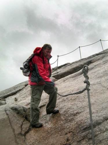«турами», частенько встречаются пятна красной краски, указывающие путь. Сначала - затяжной подъем по скользким в такую погоду, гладким камням. Для удобства туристов на особо крутых участках навешаны «перила» из железных цепей.